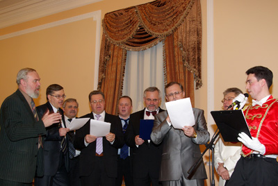 Под торжественную музыку в бальный зал вошли ректор, проректоры и директора институтов НовГУ с жёнами. Их церемонно представлял танцмейстер. Кстати, идея провести бал появилась у ректора НовГУ В.Р. Вебера неслучайно: хотелось возродить культуру традиционных старинных балов. Именно поэтому местом проведения решили сделать Новгородскую филармонию, здание с большой историей.