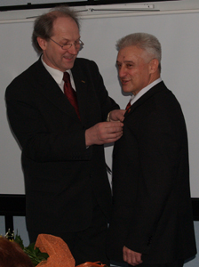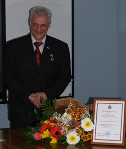 А.Л. Гавриков произнес несколько очень теплых слов и прикрепил на лацкан пиджака юбиляра почетный знак (фото слева внизу). Слова "Служу родному Отечеству!" из уст маститого ученого прозвучали совершенно искренне. Официальное лицо, заместитель губернатора Н.Н. Ренкас, рассказал, как много сделал В.Е. Гантмахер для области, и вручил ему самую высокую областную награду - Благодарственное письмо губернатора.