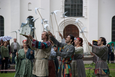 В сердце Кремля, у стен Святой Софии свою вариацию на тему уличных театров предложил театр Малый: актёры поведали зрителям целую череду легенд, связанных с возникновением самых известных новгородских церквей. Интересная задумка режиссера - макеты церквей, которые в деталях могли разглядеть зрители. В спектакле участвовали выпускники актерского отделения ИНПО.