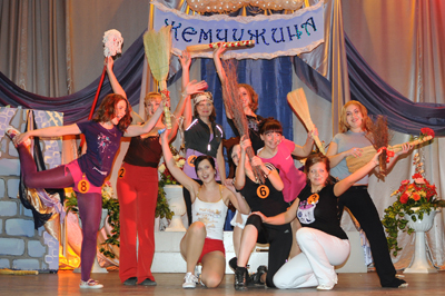 Все конкурсы можно было разделить на две части: традиционные, повторяющиеся из года в год, - "Представление", "Спортивный", "Выход в вечерних платьях" и "Кулинарный" - и новые, необычные. Например, в конкурсе модельеров надо было создать модель, которая бы убедила жюри в наличии соответствующего таланта, причем из простыни и за 5 минут. Получилось весьма разнообразно - от предсказуемой греческой туники до свадебного платья (а что, вариант очень экономный). Мне как прожженному интеллектуалу было приятно, что частью соревнований была игра "перевертыши": берется известное словосочетание, скажем, "стойкий оловянный солдатик", и в нем все слова заменяются на противоположные по значению, например, "ленивый деревянный генерал". И участницам нужно было разгадать задуманную фразу "в прямом эфире". Признаюсь, в некоторых случаях правильный ответ приходил в мою голову позже, чем его сообщали прекрасные создания со сцены. Также порадовал конкурс "Визитная карточка" в сказочном образе, где участницы выступали не только как исполнители, но и как режиссеры, поскольку чаще всего выступали в сопровождении большой группы поддержки, которой надо было искусно управлять. Большинство, естественно, увидело себя в образе разнообразных принцесс, королев и восточных владычиц. Однако симпатии жюри, судя по всему, склонились к образу: Бабы-Яги, которую представила Ольга Кузьмич из ИЭУ. Видимо, вспомнили завет бессмертного Огурцова из "Карнавальной ночи" о том, что этого персонажа надо выращивать в своем коллективе. А что принцессы? Так, отрезанный ломоть. Приедет из-за гор прекрасный принц на белом "Мерседесе", и поминай как звали!