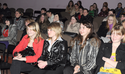 Все остальные - Студенческий союз НовГУ, Российский союз сельской молодёжи (РССМ), команда КВН "НИМО" и представители новгородского телевидения и прессы - направились в актовый зал Маловишерской библиотеки им. Пушкина для встречи с будущими студентами. В зале был аншлаг, пришло множество старшеклассников и старшеклассниц, многие даже со своими родителями. Мероприятие открыл Феликс Александрович рассказом о нашем замечательном университете, перечислив его многочисленные преимущества, в числе которых: лицензия на образование, дипломы государственного уровня, большие внешние связи, обмен студентами с другими государствами, один из лучших спортзалов Северо-Запада, широкий спектр досуговых мероприятий: конкурсы, дискотеки, КВН, предоставление общежитий всем иногородним студентам, отсрочка от армии.