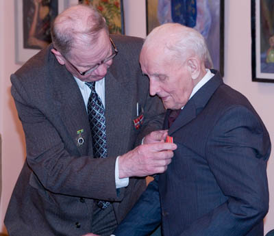 От имени ветеранов ВОВ Евгения Константиновича поздравил председатель Совета ветеранов А.А. Черезов и вручил памятную медаль от Российского комитета ветеранов, войны и военной службы (на фото вверху в центре).