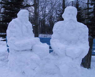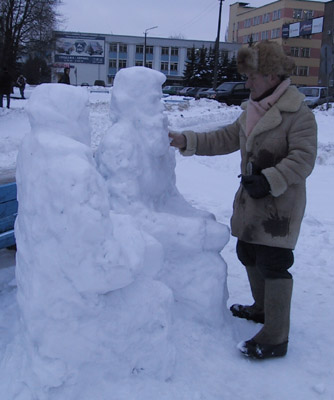 ...На прошлой неделе вышла я из университета и ахнула: прямо на меня задумчиво поглядывали старик со старухой. Да не простые, а из снега. Они уже зажили самостоятельной жизнью, а вокруг все суетился их творец - самодеятельный художник, бывший электросварщик, а ныне пенсионер Григорий Васильевич Богданов.